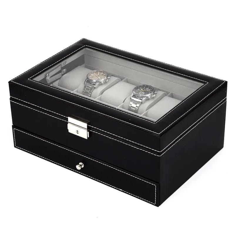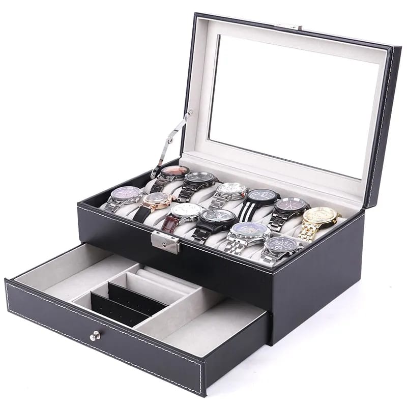 2-Layer Large Leather Watch Box Organizer Jewelry Case Display Drawer Lockable Case Organizer