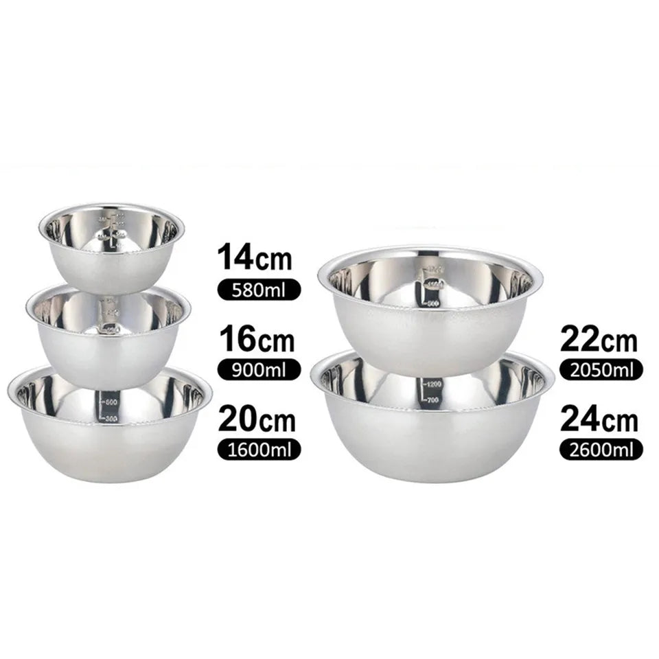 Specification: Product Name: Stainless Steel Mixing Bowl Material: stainless steel Size: 2600ml! bowl-24x8.5 cm 2100m! bowl-22x8 cm 1550mlI bowl-20x7.5 cm 800ml bowl-16x6.5 cm. 900m! bowl-14x5.5 cm