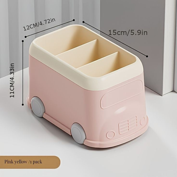 Desktop Pen Holder 3 Compartments Large Capacity Cute Bus Shape Multifunctional Office Supplies Stationery Pencil Organizer Container Storage Box