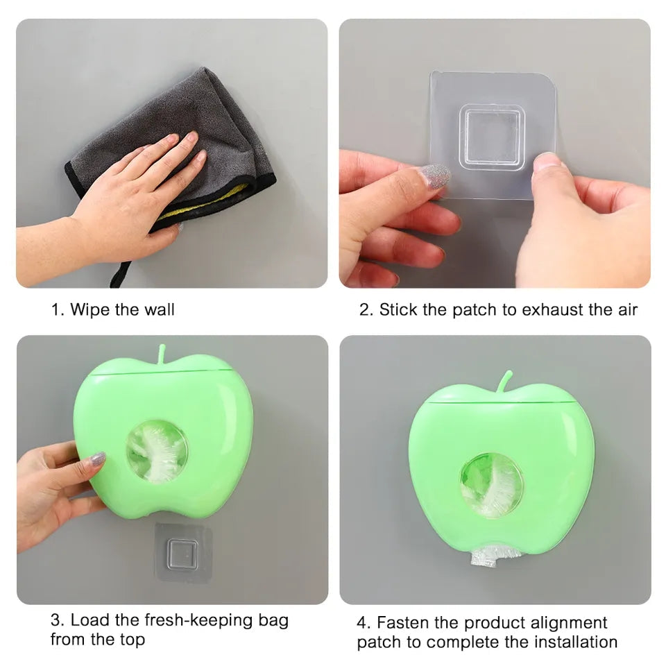 Wall Mounted Food Cover Bag Organizer can hold 100 to 120 fresh-keeping covers, has a transparent and visible design in the middle for you to conveniently check the remaining amount of the fresh-keeping bav=. and features a cross opening at the bottom for yo. A | easily take out the elastic food covers.