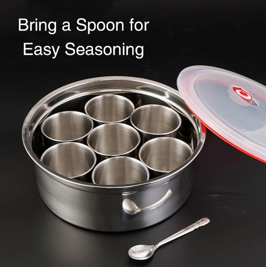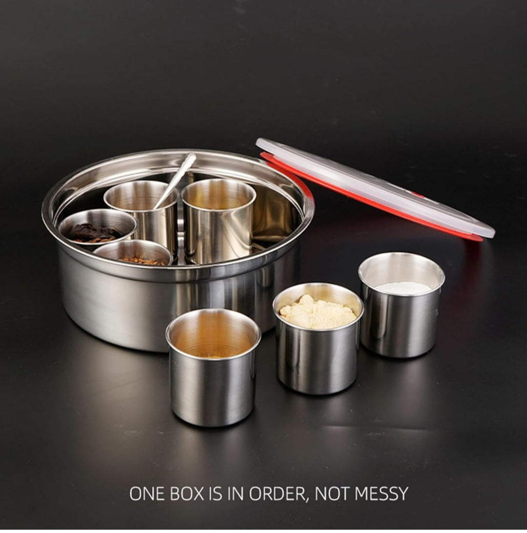e PREMIUM MATERIAL The spice box is made of high-quality 201 stainless steel, including 7 separate compartments as well as spoons, and the transparent lids is made of food-grade plastic, safe and healthy to use.