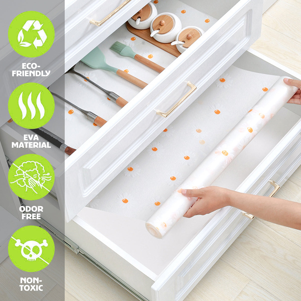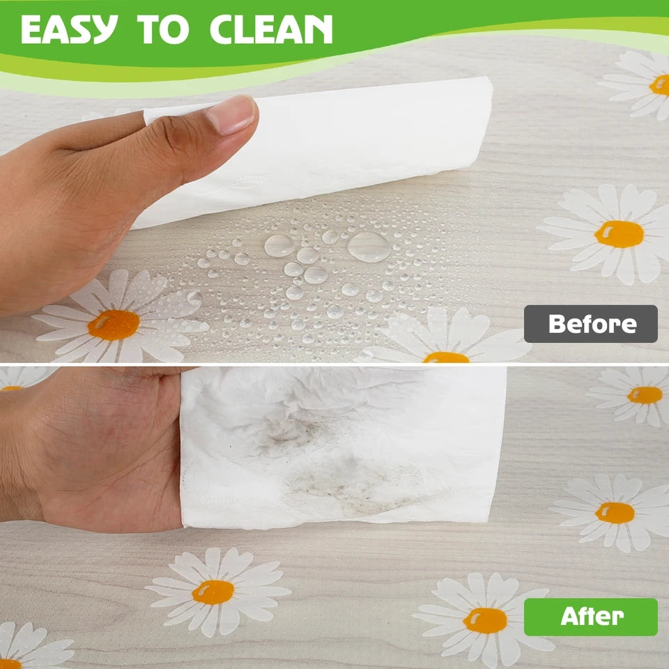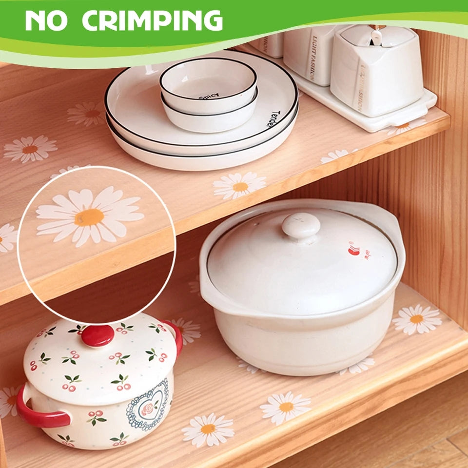 [Easy to Clean] This Daisy drawer liner is beautiful and practical, Waterproof and easy to clean. When the mat is dripping with oil, coffee, etc,simply wipe it off with a paper towel or rinse it off with water.