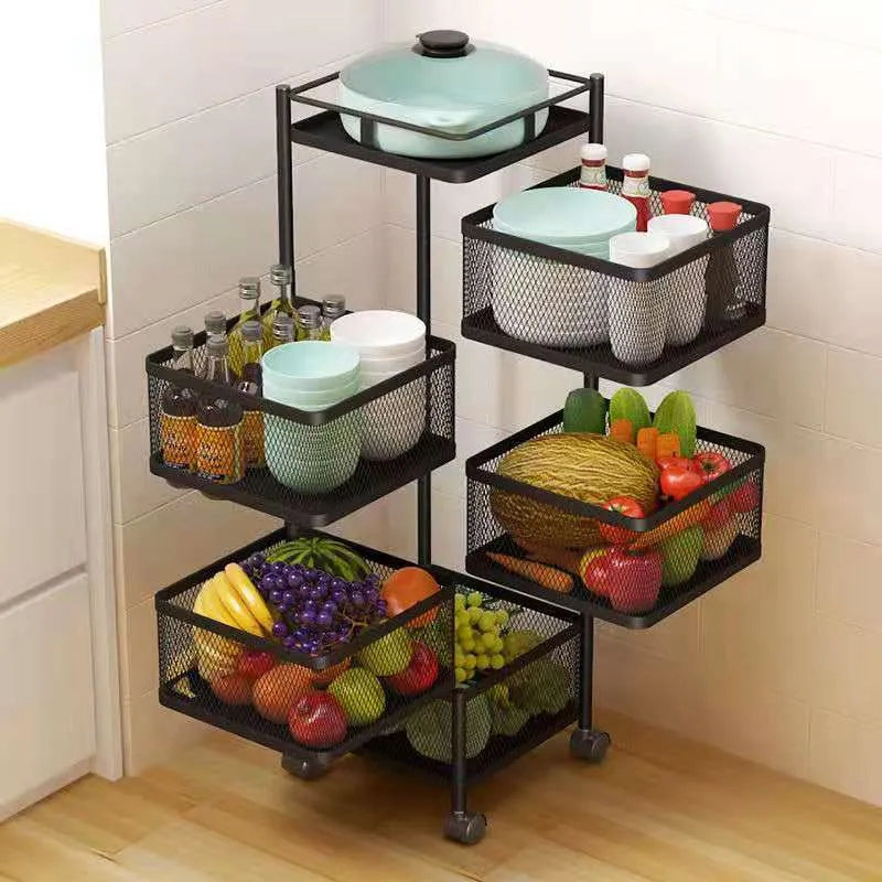 MULTI-FUNCTIONAL Each basket can be rotated to facilitate storage and taking off items. The bottom of each basket is an integrally formed pattern. Compared with the ordinary strip-shaped bottom carved design, it can better hold small objects and is more stable. ROTATING WHEELS The wheels of storage shelf rack can be rotated 360 degrees, and there are two brakes wheels for stable parking. The movable design can bring you great convenience during use.