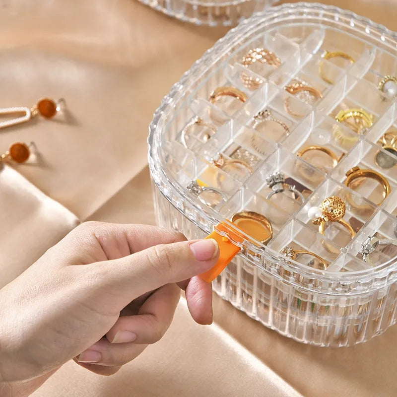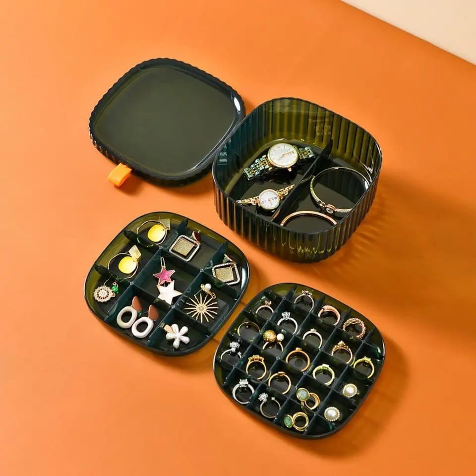 V Layered storage: The transparent jewelry box has multiple layers of different specifications to help you store different types of jewelry in an orderly manner, such as rings, earrings, bracelets, etc.; This jewelry organizer has a silicone handle for easy opening.
